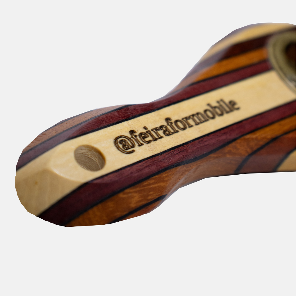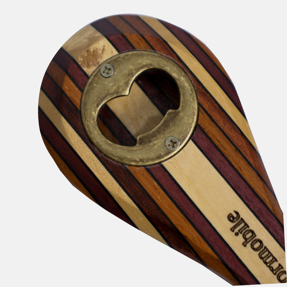 Abridor de garrafa com corpo em madeira e logo Formobile. Design ergonômico em formato de cachimbo com abridor de metal. Medidas aproximadas: 14 cm x 5 cm.